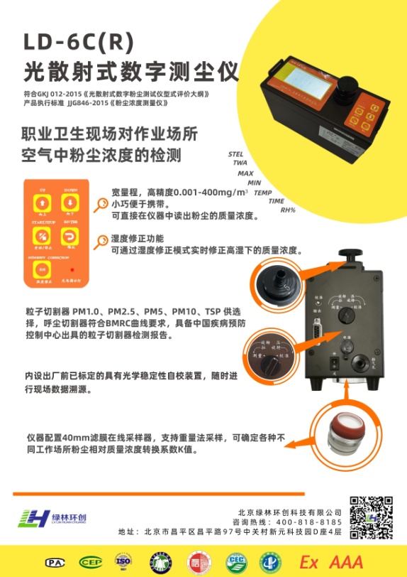 2020年最新推出防爆式數(shù)字測(cè)塵儀-LD-6C(R),主要用于職業(yè)衛(wèi)生現(xiàn)場(chǎng)對(duì)作業(yè)場(chǎng)所空氣中粉塵濃度的檢測(cè)。符合GKJ012-2015《光散射式數(shù)字粉塵測(cè)試儀型式評(píng)價(jià)大綱》產(chǎn)品執(zhí)行標(biāo)準(zhǔn)JJG846-2015《粉塵濃度測(cè)量?jī)x》??伤椭辆哂蠧MA資質(zhì)的國(guó)家級(jí)檢測(cè)單位出具校準(zhǔn)證書。